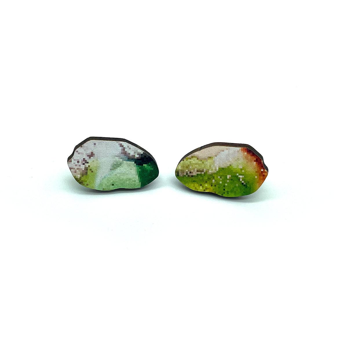 Lush Pie Earrings draw inspiration from dense forests and vibrant natural landscapes. Earthy browns and deep greens evoke the richness of foliage, while subtle contrasts create a bold, organic look that transitions effortlessly from day to night. Featuring a rock-like stud shape that adds a unique, textured edge with a raw, grounded feel.